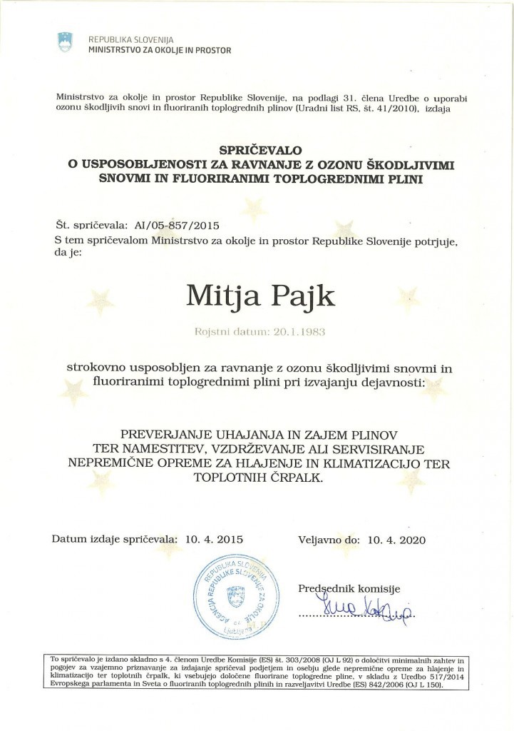 Usposobljeni smo tudi za ravnanje z ozonu škodljivimi snovni in fluoriranimi toplogrednimi plini, ki ga dodeli ARSO (Agencija Republike Slovenije za okolje in prostor) za varno in okolju neškodljivo montažo vseh vrst klimatskih naprav.