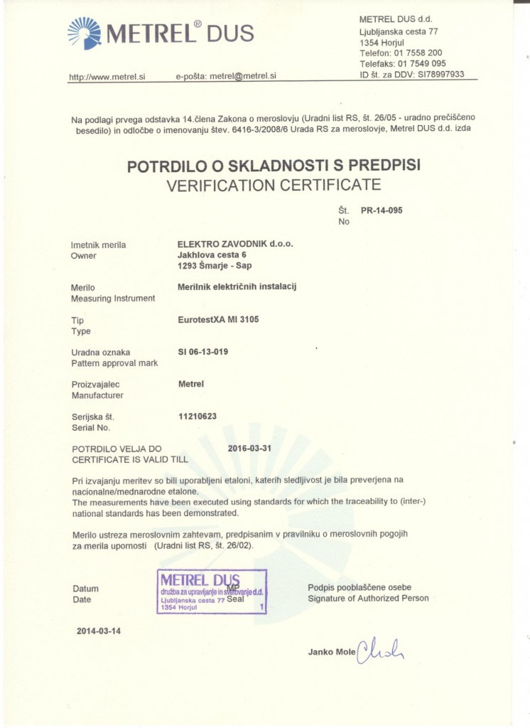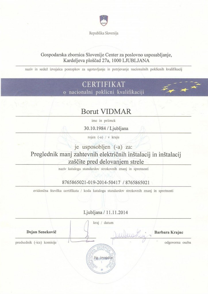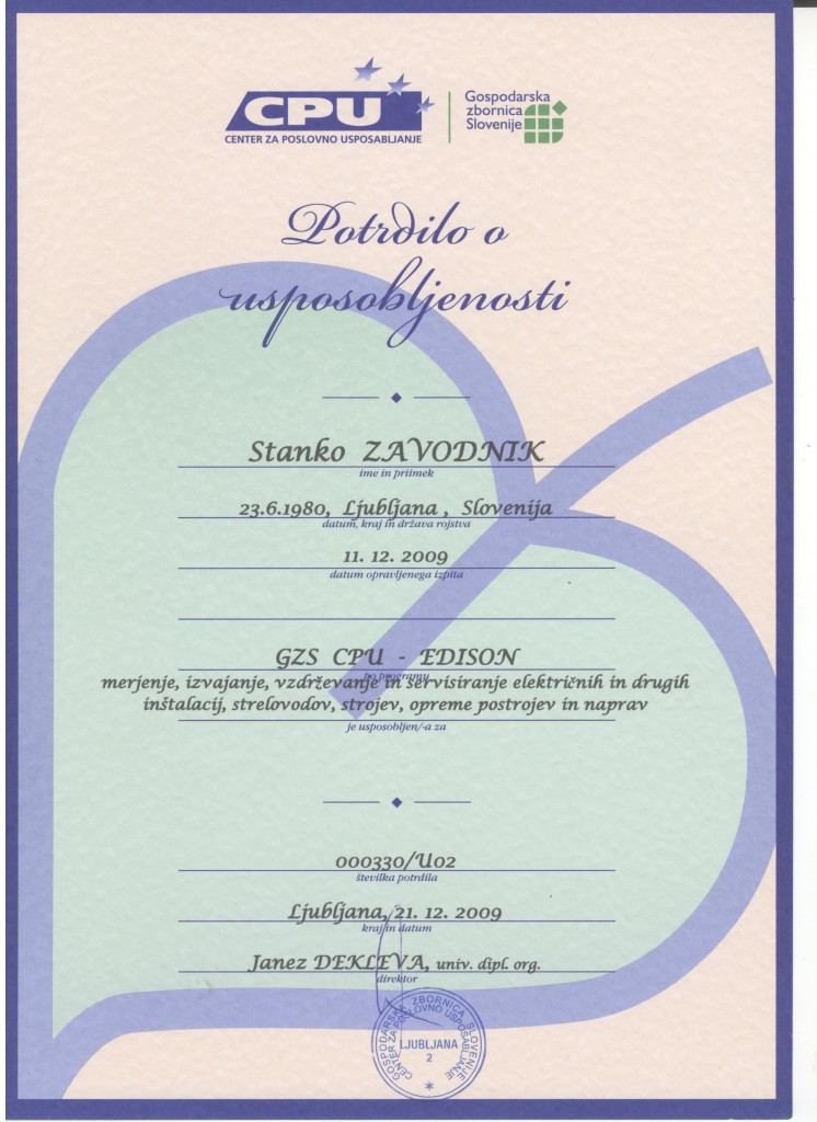 Z ustreznimi certifikati dokazujemo ustrezno usposobljenost našega podjetju Elektro Zavodnik za kvalitetno in zanesljivo delo.